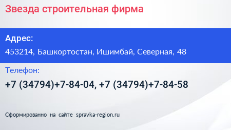 Звезда, строительная фирма по адресу 453214, Башкортостан, Ишимбай, Северная, 48 в дальнейшем Организация, размещена в следующих категориях: