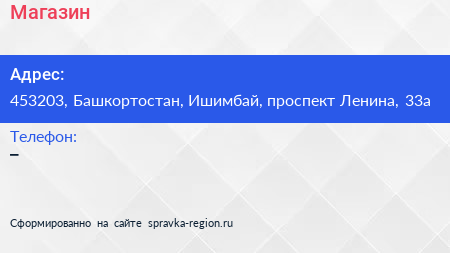 Магазин по адресу 453203, Башкортостан, Ишимбай, проспект Ленина, 33а в дальнейшем Организация, размещена в следующих категориях: