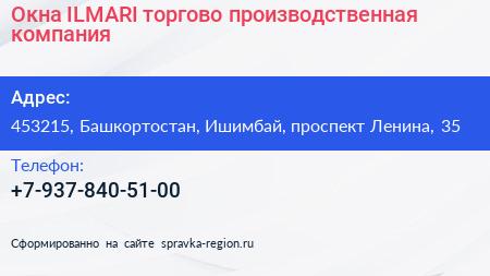 Окна ILMARI, торгово-производственная компания по адресу 453215, Башкортостан, Ишимбай, проспект Ленина, 35 в дальнейшем Организация, размещена в следующих категориях: