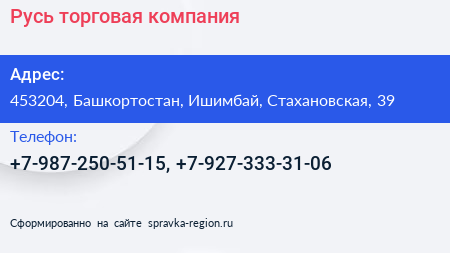 Русь, торговая компания по адресу 453204, Башкортостан, Ишимбай, Стахановская, 39 в дальнейшем Организация, размещена в следующих категориях: