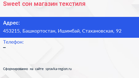 Sweet сон, магазин текстиля по адресу 453215, Башкортостан, Ишимбай, Стахановская, 92 в дальнейшем Организация, размещена в следующих категориях:
