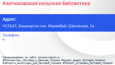 Кантюковская сельская библиотека по адресу 453167, Башкортостан, Ишимбай, Школьная, 1а в дальнейшем Организация, размещена в следующих категориях:
