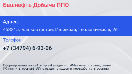 Башнефть-Добыча, ППО по адресу 453215, Башкортостан, Ишимбай, Геологическая, 26 в дальнейшем Организация, размещена в следующих категориях: