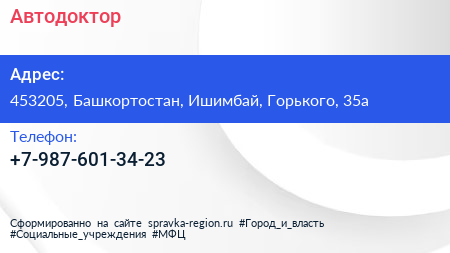 Автодоктор по адресу 453205, Башкортостан, Ишимбай, Горького, 35а в дальнейшем Организация, размещена в следующих категориях: