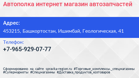 Автополка, интернет-магазин автозапчастей по адресу 453215, Башкортостан, Ишимбай, Геологическая, 41 в дальнейшем Организация, размещена в следующих категориях: