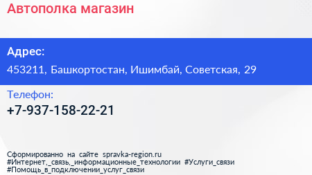 Автополка, магазин по адресу 453211, Башкортостан, Ишимбай, Советская, 29 в дальнейшем Организация, размещена в следующих категориях: