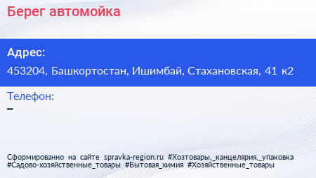 Берег, автомойка по адресу 453204, Башкортостан, Ишимбай, Стахановская, 41 к2 в дальнейшем Организация, размещена в следующих категориях: