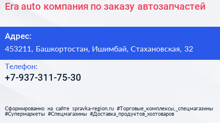 Era-auto, компания по заказу автозапчастей по адресу 453211, Башкортостан, Ишимбай, Стахановская, 32 в дальнейшем Организация, размещена в следующих категориях: