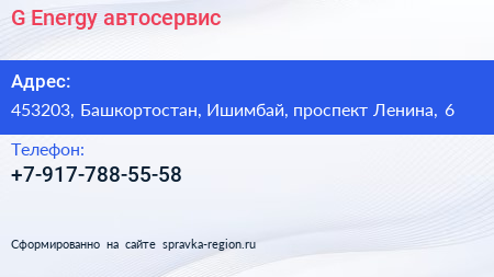 G-Energy, автосервис по адресу 453203, Башкортостан, Ишимбай, проспект Ленина, 6 в дальнейшем Организация, размещена в следующих категориях: