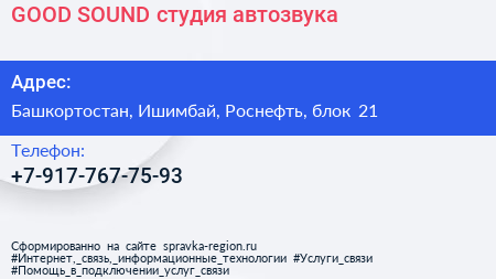 GOOD SOUND, студия автозвука по адресу Башкортостан, Ишимбай, Роснефть, блок 21 в дальнейшем Организация, размещена в следующих категориях: