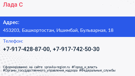 Лада-С по адресу 453203, Башкортостан, Ишимбай, Бульварная, 18 в дальнейшем Организация, размещена в следующих категориях: