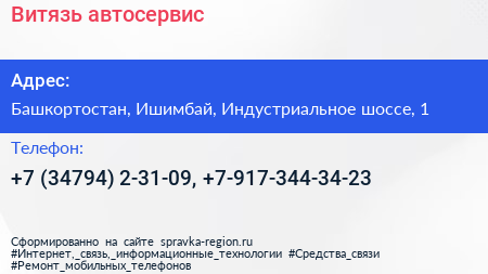 Для связи с организацией воспользуйтесь номером телефона: +7 (34794) 2-31-09, +7-917-344-34-23. Пн: c 09:00-20:00, Вт: c 09:00-20:00, Ср: c 09:00-20:00, Чт: c 09:00-20:00, Пт: c 09:00-20:00, Сб: c 09:00-20:00, Вс: выходной, вы можете обратиться в эту организацию.