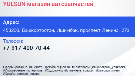 YULSUN, магазин автозапчастей по адресу 453203, Башкортостан, Ишимбай, проспект Ленина, 27а в дальнейшем Организация, размещена в следующих категориях: