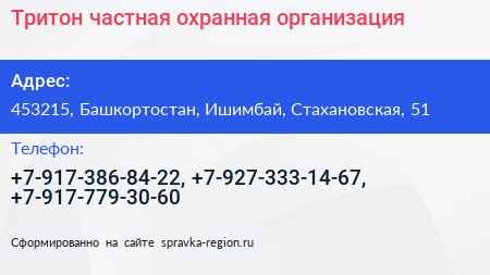 Тритон, частная охранная организация по адресу 453215, Башкортостан, Ишимбай, Стахановская, 51 в дальнейшем Организация, размещена в следующих категориях: