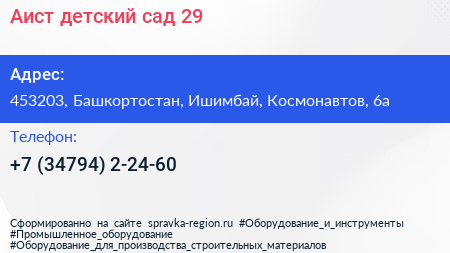 Аист, детский сад №29 по адресу 453203, Башкортостан, Ишимбай, Космонавтов, 6а в дальнейшем Организация, размещена в следующих категориях: