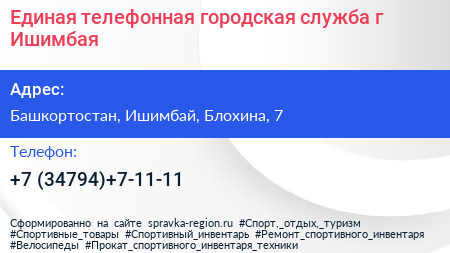 Единая телефонная городская служба г. Ишимбая по адресу Башкортостан, Ишимбай, Блохина, 7 в дальнейшем Организация, размещена в следующих категориях: