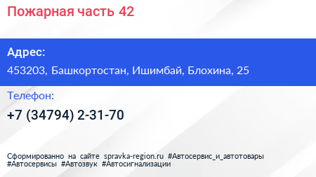 Пожарная часть №42 по адресу 453203, Башкортостан, Ишимбай, Блохина, 25 в дальнейшем Организация, размещена в следующих категориях: