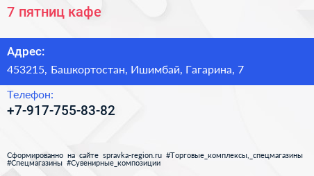 7 пятниц, кафе по адресу 453215, Башкортостан, Ишимбай, Гагарина, 7 в дальнейшем Организация, размещена в следующих категориях: