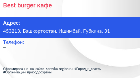 Best burger, кафе по адресу 453213, Башкортостан, Ишимбай, Губкина, 31 в дальнейшем Организация, размещена в следующих категориях: