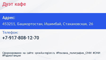 Дуэт, кафе по адресу 453211, Башкортостан, Ишимбай, Стахановская, 26 в дальнейшем Организация, размещена в следующих категориях: