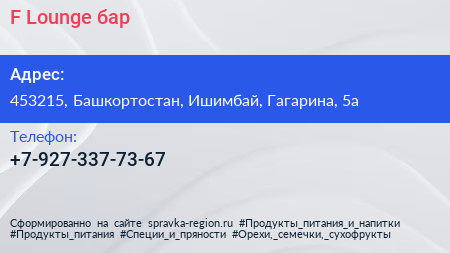 F-Lounge, бар по адресу 453215, Башкортостан, Ишимбай, Гагарина, 5а в дальнейшем Организация, размещена в следующих категориях:
