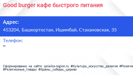 Good burger, кафе быстрого питания по адресу 453204, Башкортостан, Ишимбай, Стахановская, 35 в дальнейшем Организация, размещена в следующих категориях: