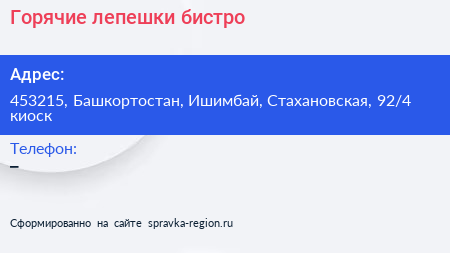 Горячие лепешки, бистро по адресу 453215, Башкортостан, Ишимбай, Стахановская, 92/4 киоск в дальнейшем Организация, размещена в следующих категориях: