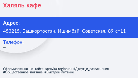 Халяль, кафе по адресу 453215, Башкортостан, Ишимбай, Советская, 89 ст11 в дальнейшем Организация, размещена в следующих категориях: