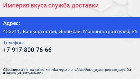 Империя вкуса, служба доставки по адресу 453211, Башкортостан, Ишимбай, Машиностроителей, 96 в дальнейшем Организация, размещена в следующих категориях: