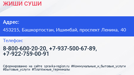 ЖИШИ СУШИ по адресу 453215, Башкортостан, Ишимбай, проспект Ленина, 40 в дальнейшем Организация, размещена в следующих категориях: