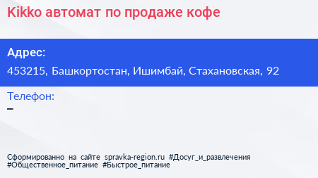 Kikko, автомат по продаже кофе по адресу 453215, Башкортостан, Ишимбай, Стахановская, 92 в дальнейшем Организация, размещена в следующих категориях: