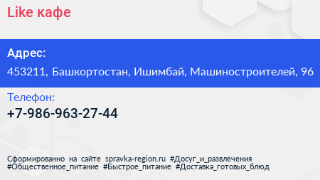 Like, кафе по адресу 453211, Башкортостан, Ишимбай, Машиностроителей, 96 в дальнейшем Организация, размещена в следующих категориях: