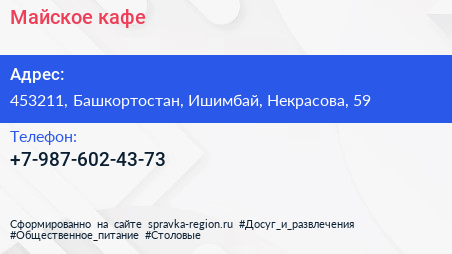 Майское, кафе по адресу 453211, Башкортостан, Ишимбай, Некрасова, 59 в дальнейшем Организация, размещена в следующих категориях: