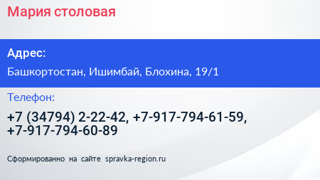 Мария, столовая по адресу Башкортостан, Ишимбай, Блохина, 19/1 в дальнейшем Организация, размещена в следующих категориях:
