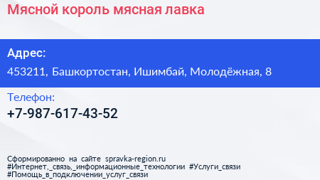 Мясной король, мясная лавка по адресу 453211, Башкортостан, Ишимбай, Молодёжная, 8 в дальнейшем Организация, размещена в следующих категориях: