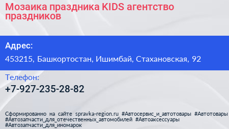Мозаика праздника KIDS, агентство праздников по адресу 453215, Башкортостан, Ишимбай, Стахановская, 92 в дальнейшем Организация, размещена в следующих категориях: