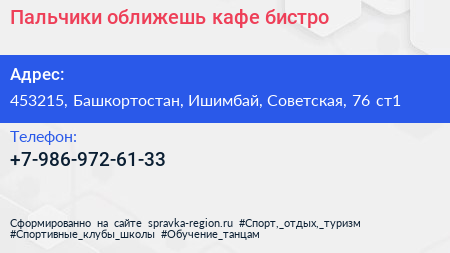 Пальчики оближешь, кафе-бистро по адресу 453215, Башкортостан, Ишимбай, Советская, 76 ст1 в дальнейшем Организация, размещена в следующих категориях: