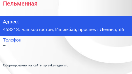 Пельменная по адресу 453213, Башкортостан, Ишимбай, проспект Ленина, 66 в дальнейшем Организация, размещена в следующих категориях: