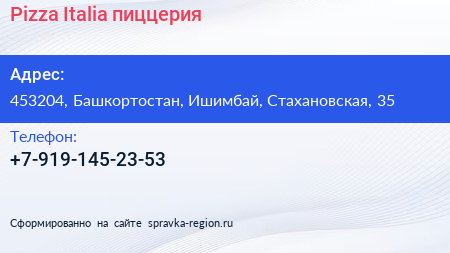 Pizza Italia, пиццерия по адресу 453204, Башкортостан, Ишимбай, Стахановская, 35 в дальнейшем Организация, размещена в следующих категориях: