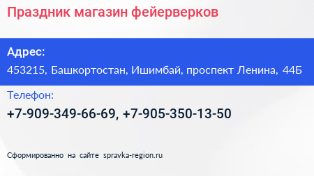 Праздник, магазин фейерверков по адресу 453215, Башкортостан, Ишимбай, проспект Ленина, 44Б в дальнейшем Организация, размещена в следующих категориях: