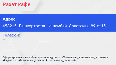 Рахат, кафе по адресу 453215, Башкортостан, Ишимбай, Советская, 89 ст15 в дальнейшем Организация, размещена в следующих категориях: