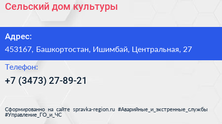 Сельский дом культуры по адресу 453167, Башкортостан, Ишимбай, Центральная, 27 в дальнейшем Организация, размещена в следующих категориях: