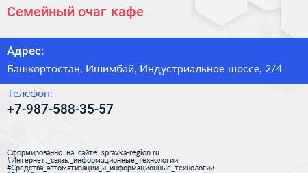 Семейный очаг, кафе по адресу Башкортостан, Ишимбай, Индустриальное шоссе, 2/4 в дальнейшем Организация, размещена в следующих категориях: