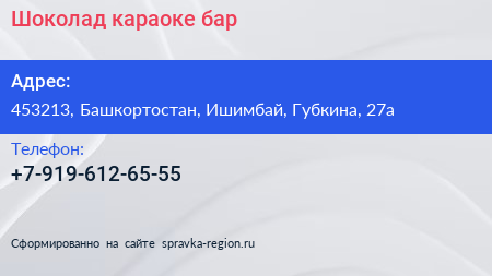 Шоколад, караоке-бар по адресу 453213, Башкортостан, Ишимбай, Губкина, 27а в дальнейшем Организация, размещена в следующих категориях: