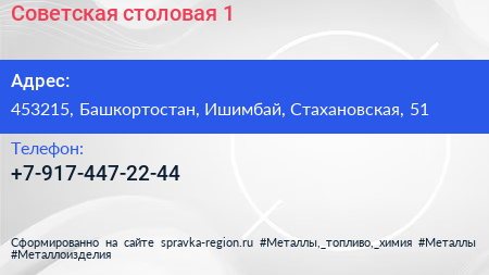 Советская столовая №1 по адресу 453215, Башкортостан, Ишимбай, Стахановская, 51 в дальнейшем Организация, размещена в следующих категориях: