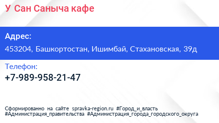 У Сан-Саныча, кафе по адресу 453204, Башкортостан, Ишимбай, Стахановская, 39д в дальнейшем Организация, размещена в следующих категориях: