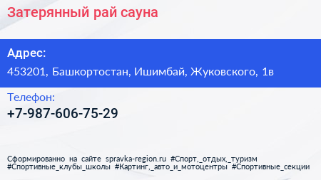 Затерянный рай, сауна по адресу 453201, Башкортостан, Ишимбай, Жуковского, 1в в дальнейшем Организация, размещена в следующих категориях: