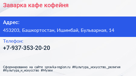 Заварка, кафе-кофейня по адресу 453203, Башкортостан, Ишимбай, Бульварная, 14 в дальнейшем Организация, размещена в следующих категориях: