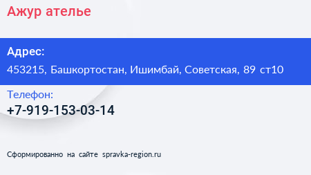 Ажур, ателье по адресу 453215, Башкортостан, Ишимбай, Советская, 89 ст10 в дальнейшем Организация, размещена в следующих категориях: