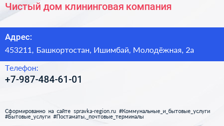 Чистый дом, клининговая компания по адресу 453211, Башкортостан, Ишимбай, Молодёжная, 2а в дальнейшем Организация, размещена в следующих категориях: